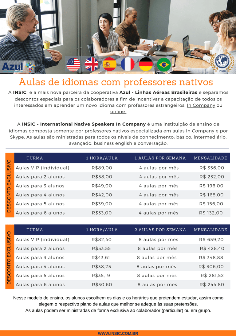 Em parceria com a INSIC e a Azul Linhas Aéreas, temos o prazer de oferecer aos nossos colaboradores descontos exclusivos em aulas de idiomas, tanto presenciais na sede Azul como online. Com aulas ministradas por professores nativos, garantimos um aprendizado de qualidade e eficácia.