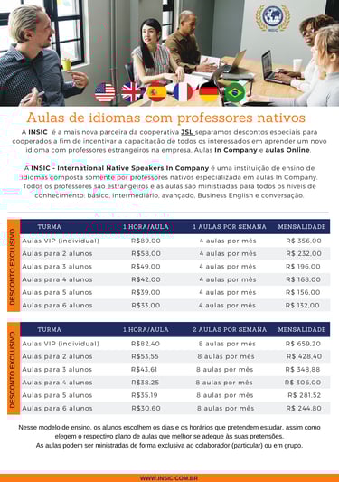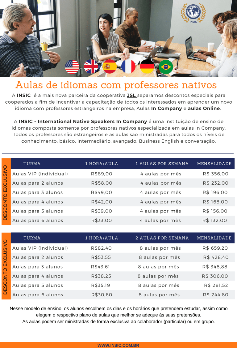 Ao optar por nossas aulas In Company, você terá a flexibilidade de agendar os dias e horários mais convenientes para as suas aulas. Nossos experientes professores nativos irão até você, adaptando-se à sua rotina. Seja antes do início do expediente, durante o horário de almoço, no final do expediente ou em outro horário que melhor se adeque a você e/ou ao seu grupo.